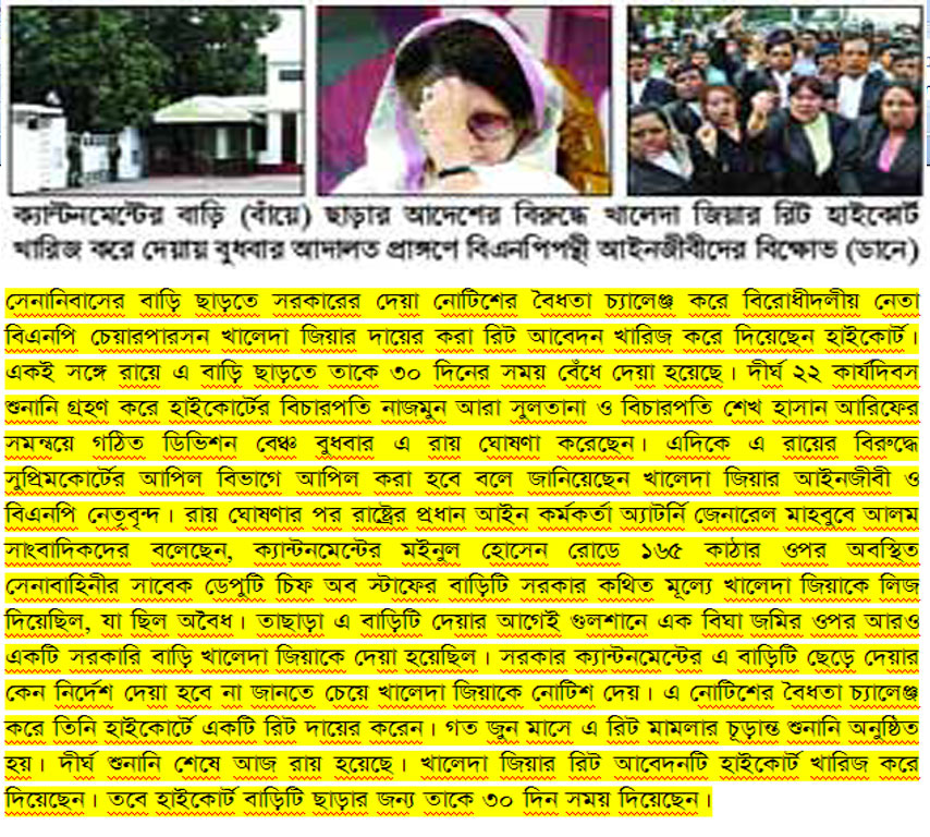 কেন এত মাতম? বস্তুত ক্যান্টনমেন্টের বাড়িটি হাত ছাড়া হয়ে গেলে তথাকথিত বাংলাদেশী জাতীয়তাবাদী দলটির বহুদলীয় গণতন্ত্র বা আইনের শাসনের ওপর থেকে যে মিলিটারি গিলাপটি সরে যাবে। নইলে সরকারের দেয়া গুলশানে প্রায় ৭০/৮০ কোটি টাকা মূল্যের একটি বাড়ি থাকতে কেন তিনি ক্যান্টনমেন্টে বাড়ি ছাড়তে চাইছেন না? অথচ এই ক্যান্টনমেন্টে বসবাসের কারণে তাঁর দলীয় নেতা-কমর্ী-সমর্থকরা তার সাথে দেখা করতে পারেন না। কাজেই এ বাড়ি ছেড়ে গুলশানের বাড়িতে গেলে নেতা-কমর্ীরা তার সাথে সহজেই দেখা করতে পারবেন। কোন বাধার সম্মুখীন হবেন না। আমি নিজেও মনে করি বেগম খালেদা জিয়া গুলশানের বাড়িতে এলে তিনি আর জনবিচ্ছিন্ন ক্যান্টনমেন্টবাসিনী থাকবেন না বরং জনগণের কাছাকাছি চলে আসবেন। সীমাহীন সম্পদের লোভ থাকলে ভিন্ন কথা।